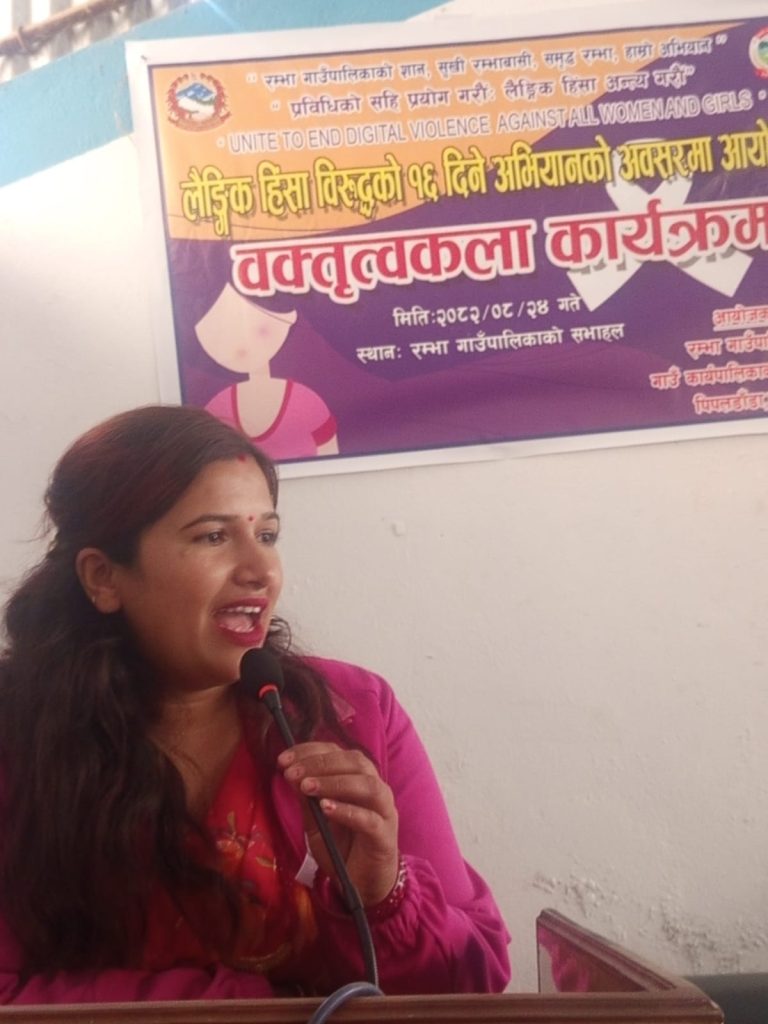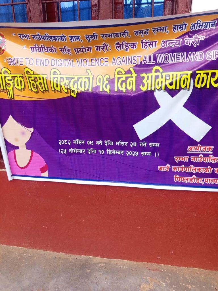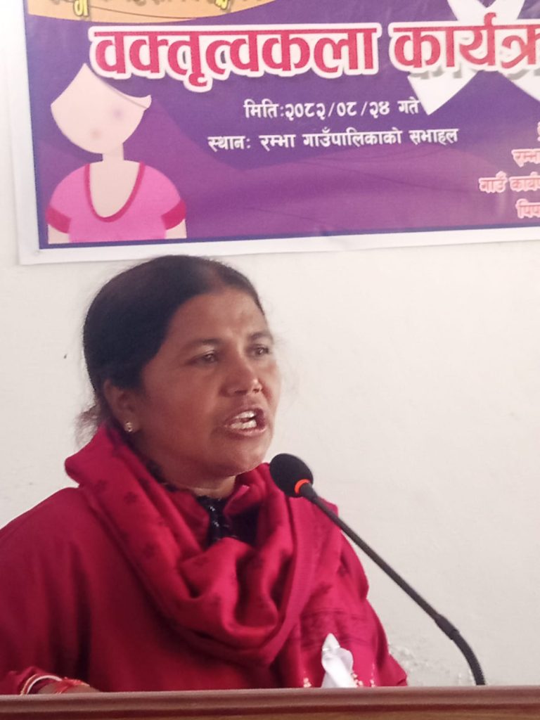 रम्भा गाउपालिका ले लैङ्गिक हिंसा बिरूद्धकाे १६ दिने अभियान अन्तर्गत नाेभेम्बर २५ देखि डिसेम्बर १० सम्म विभिन्न रचनात्मक कार्यक्रम हरू संचालन गरेर सम्पन्न गरेकाे प्रमुख प्रशासकिय अधिकृत वीर बहादुर पुन ले बताउनु भयाे।