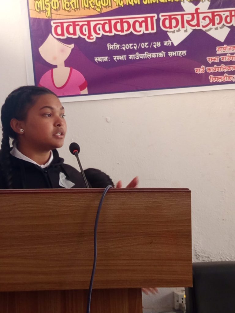 अभियानकाे अन्तिम दिन “प्रबिधिकाे सहि प्रयाेग गराै, लैङ्गिक हिंसा अन्त्य गराै” भन्ने बिषयमा वडा स्तरिय तथा माध्यमिक बिध्यालय स्तरिय बक्तृत्वकला प्रतियाेगिता कार्यक्रम उत्साहजनक सहभागितामा सम्पन्न गरेकाे थियाे।