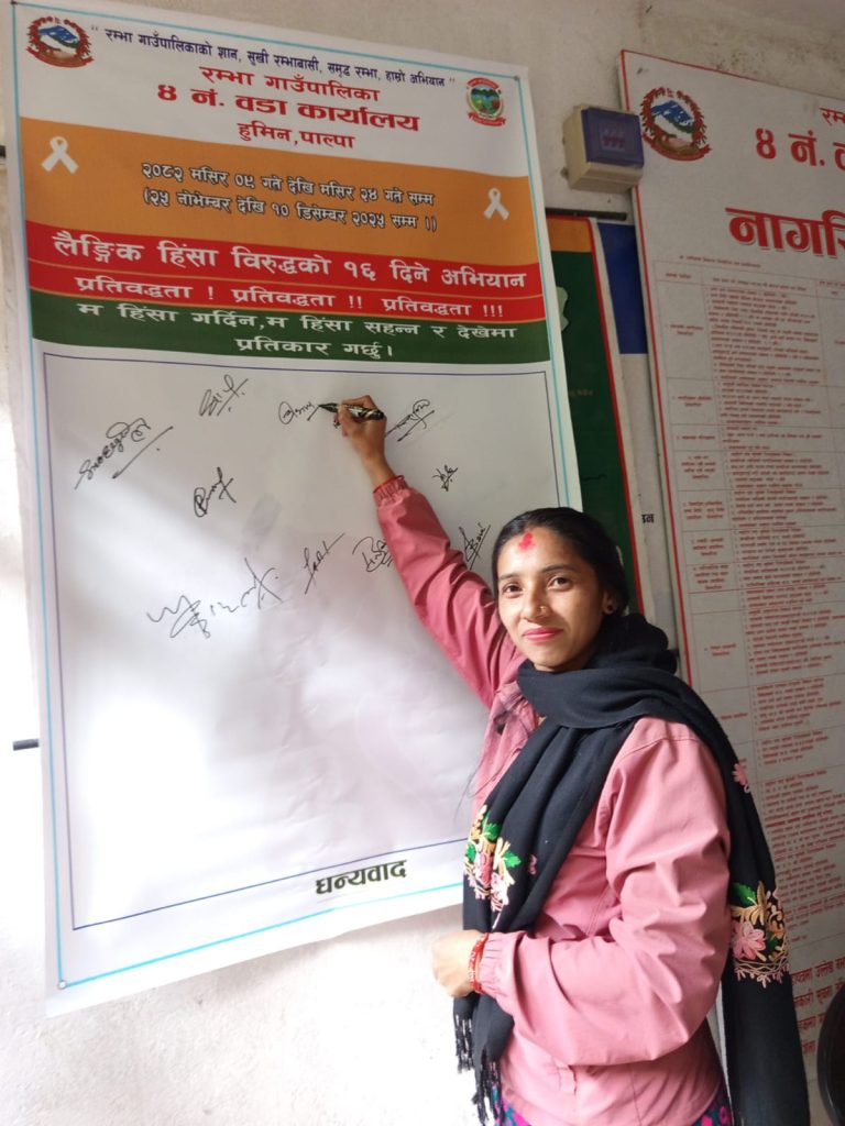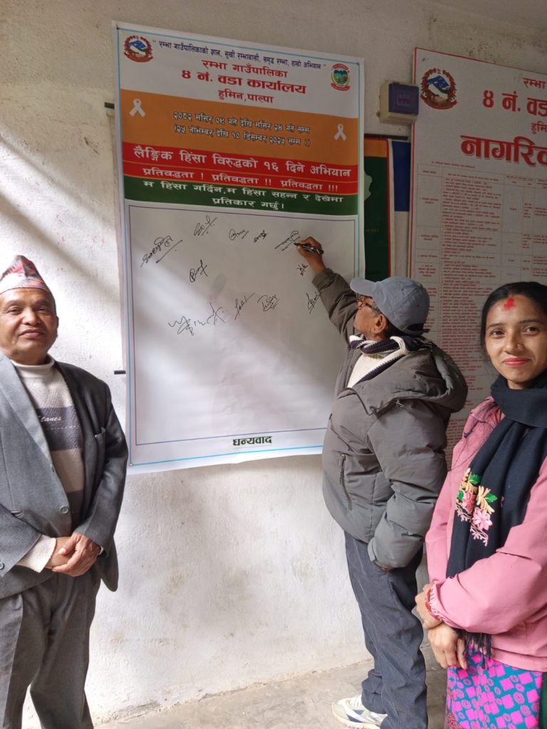 गाउपालिकाले आफ्ना ५ वटै वडा कार्यालयरू मार्फत – “म हिंसा गर्दिन, म हिंसा सहन्न, हिंसा भएकाे देखेमा प्रतिकार गर्छु” भन्ने प्रतिबद्धता व्यानरमा सराेकारवाला सबैलाइ हस्ताक्षर गराइ प्रतिबद्ध गरायकाे थियाे ।