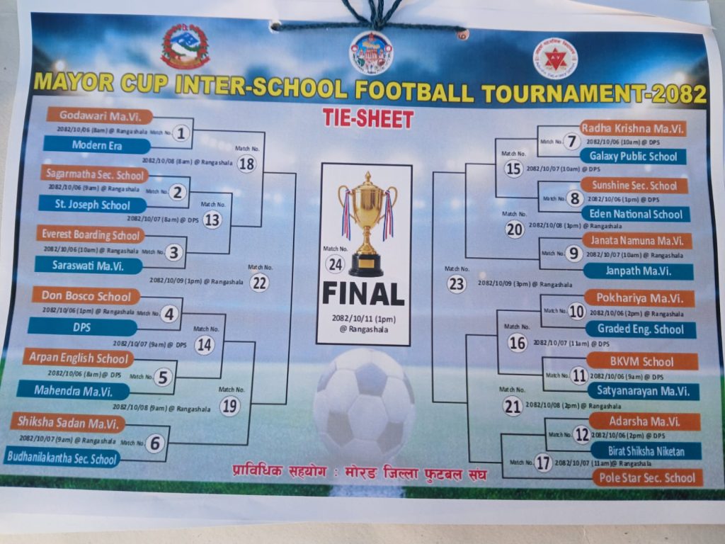 मेयर कप फुटबल प्रतियोगिताका प्रधानाध्यापक तथा संयोजक सन्तोष पोखरेलले प्रतियोगितामा विराटनगरका विभिन्न विद्यालयका २५ टिमको सहभागिता रहने जानकारी दिए। उनका अनुसार प्रतियोगिताअन्तर्गत जम्मा २४ खेलहरू सञ्चालन हुनेछन्।