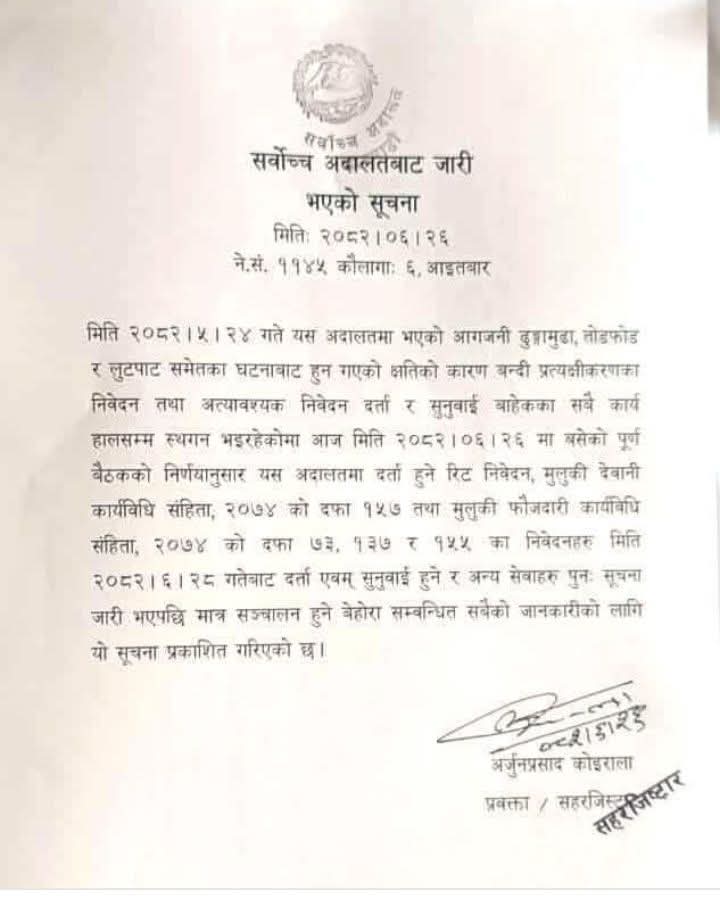 देशकै सर्वोच्च अदालतले आज एक ऐतिहासिक सूचना जारी गर्दै आगलागी र तोडफोडका घटनापछि रोकिएका सबै रिट, मुद्दा र निवेदन दर्ता तथा सुनुवाइ कार्य पुनः सुरु हुने घोषणा गरेको छ।